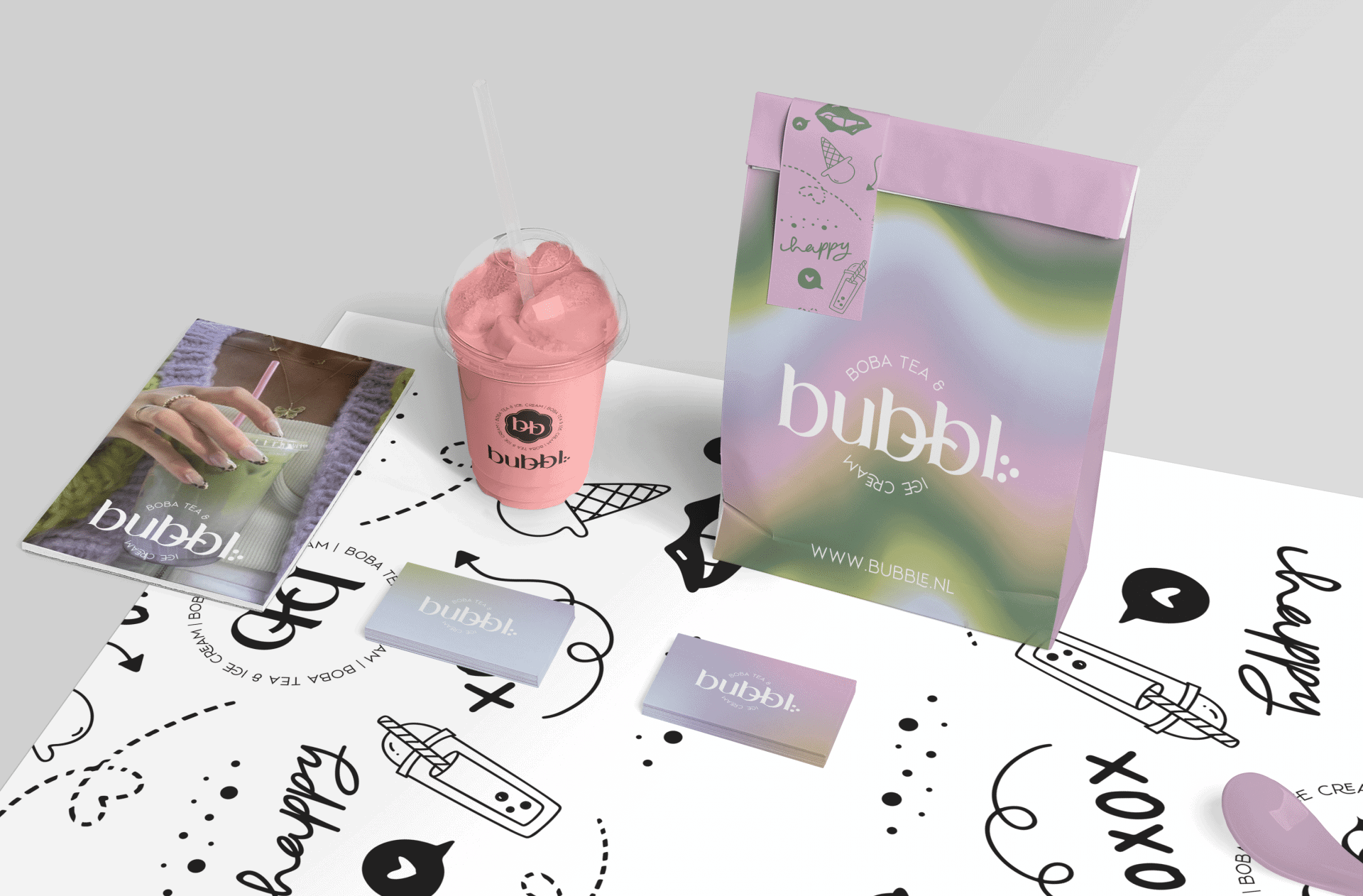 Voor een Bubble tea bedrijf heb ik een complete brand mogen verzinnen. Van a tot z heb ik het concept bedacht plus de uitwerking van de visuele indentiteit.